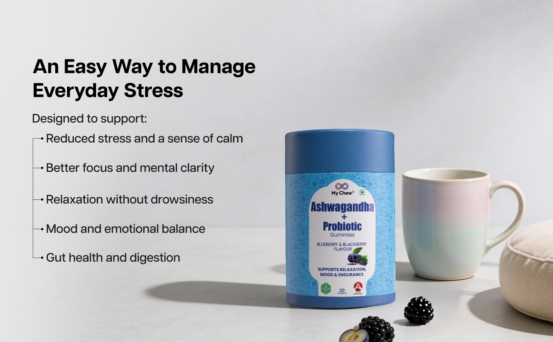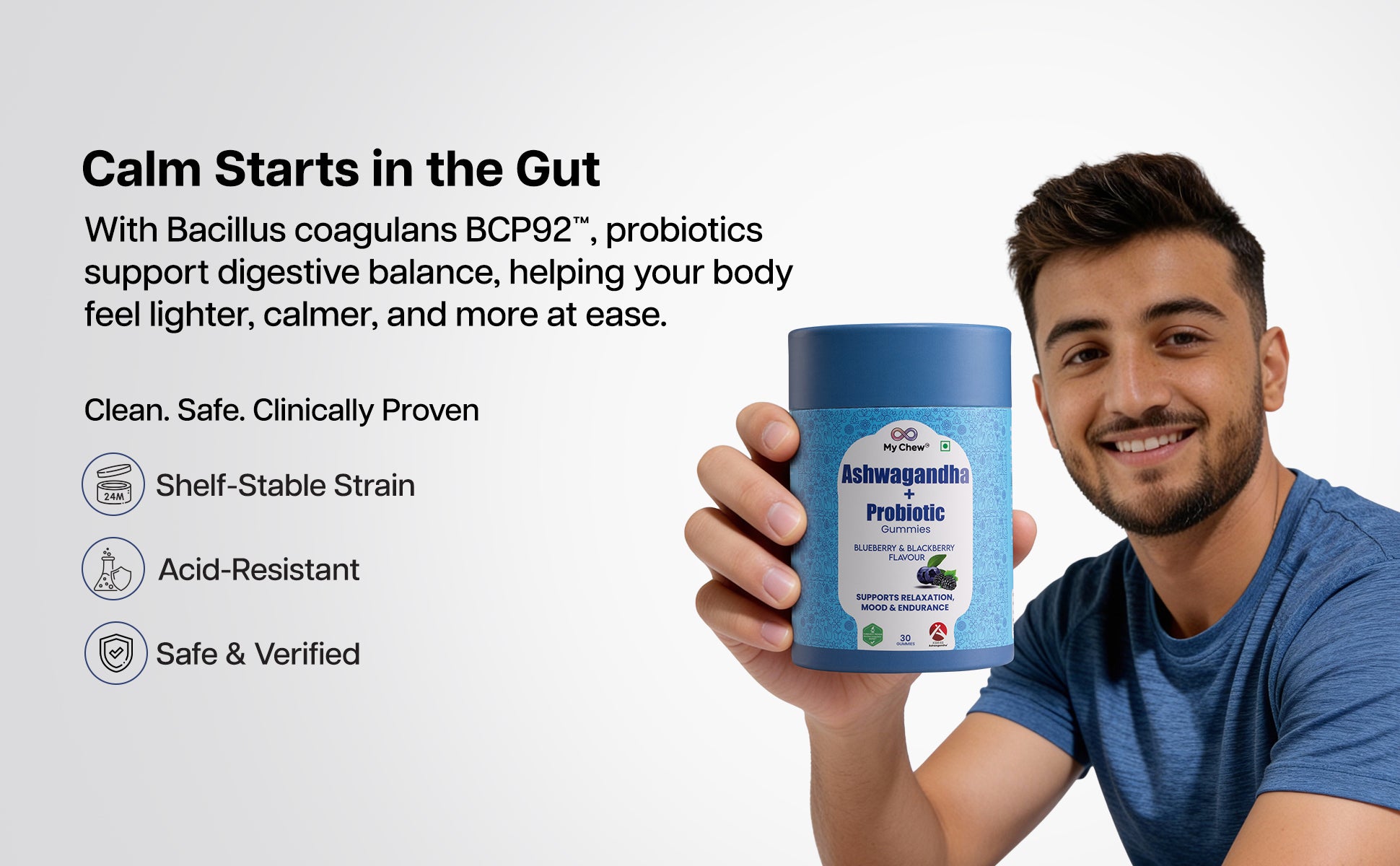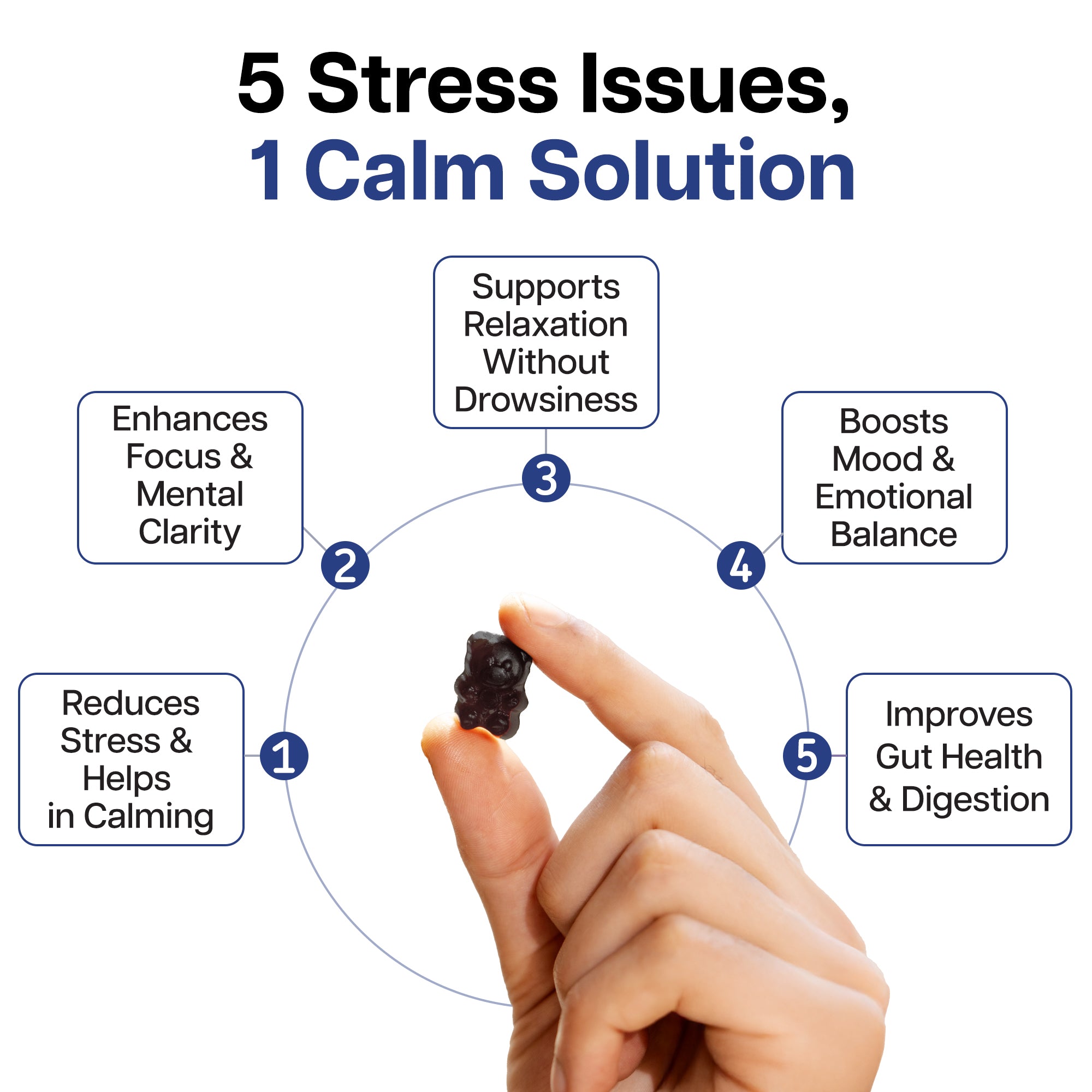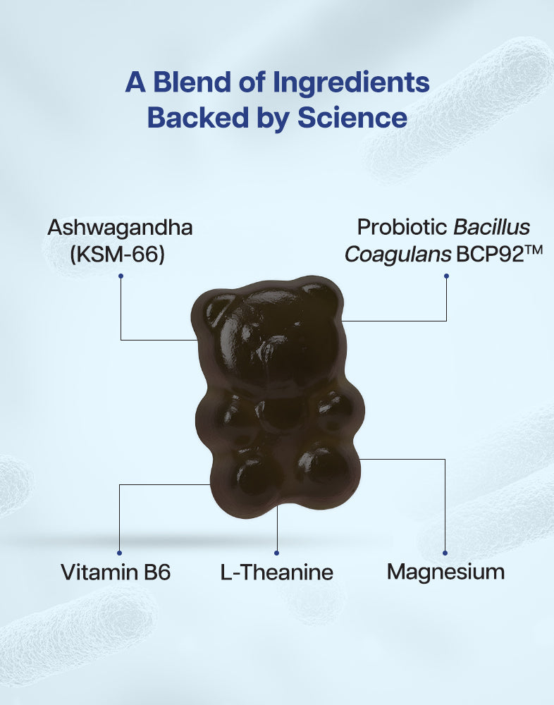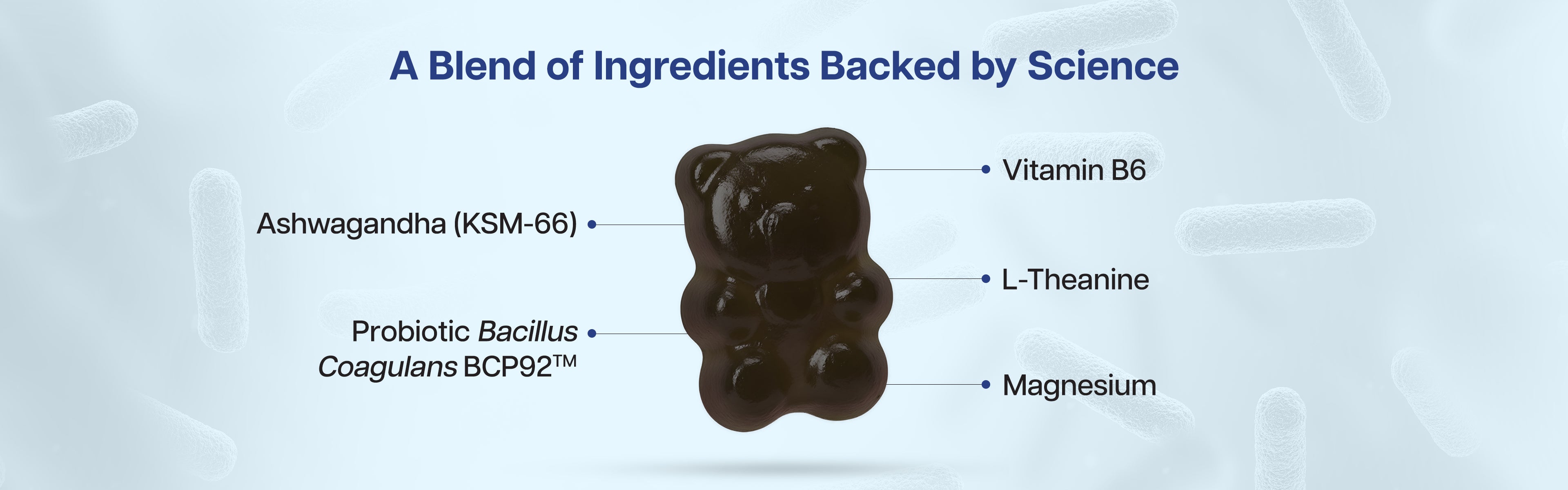 Berry-flavored gummies combining Ashwagandha, Vitamin D3, and BCP92™ probiotics to promote calm, cognitive clarity, and immune support.