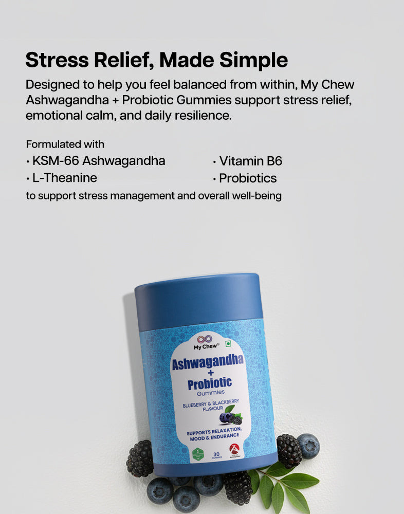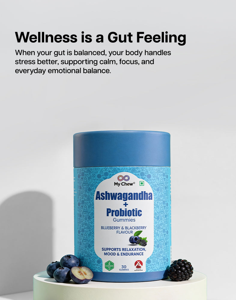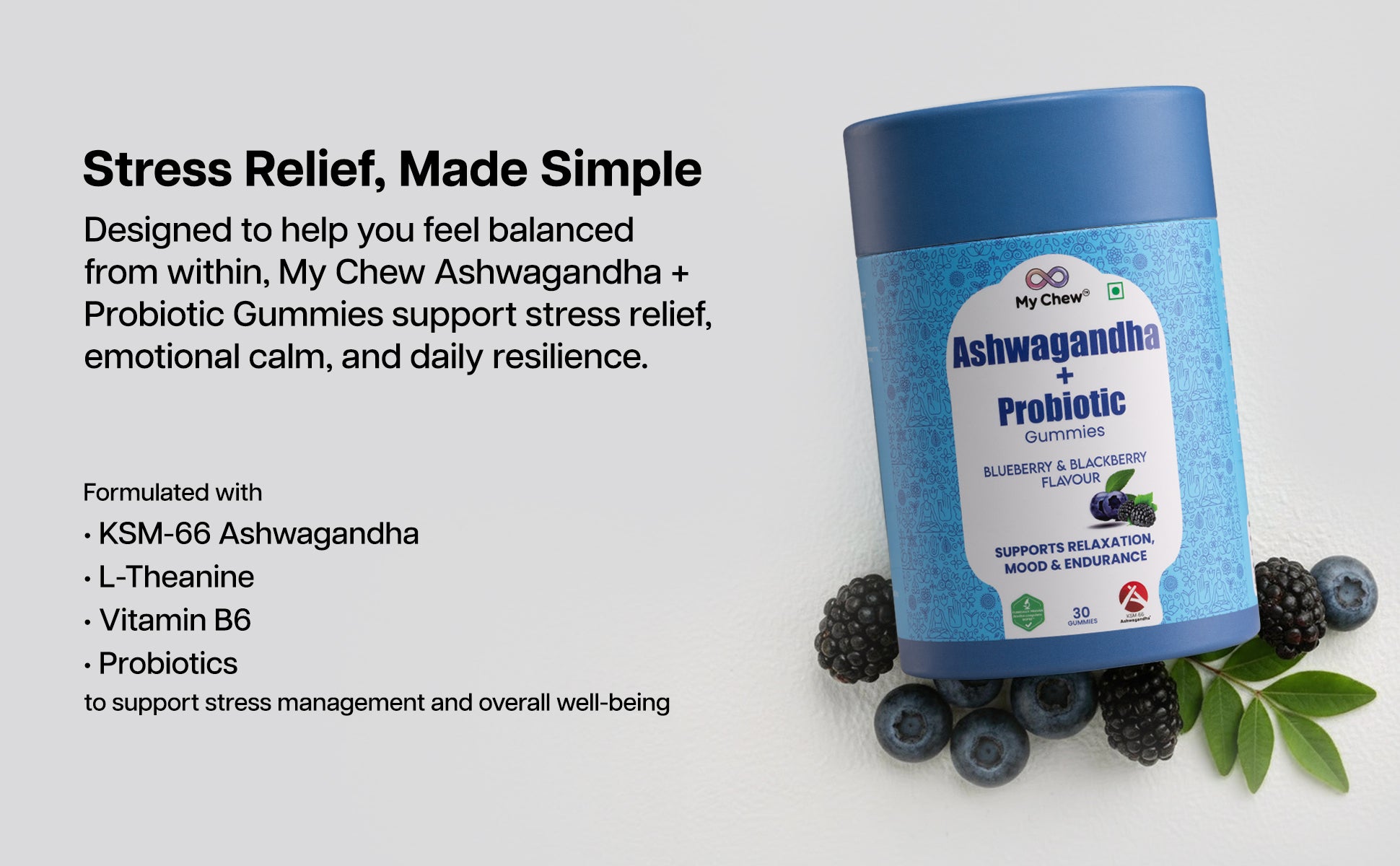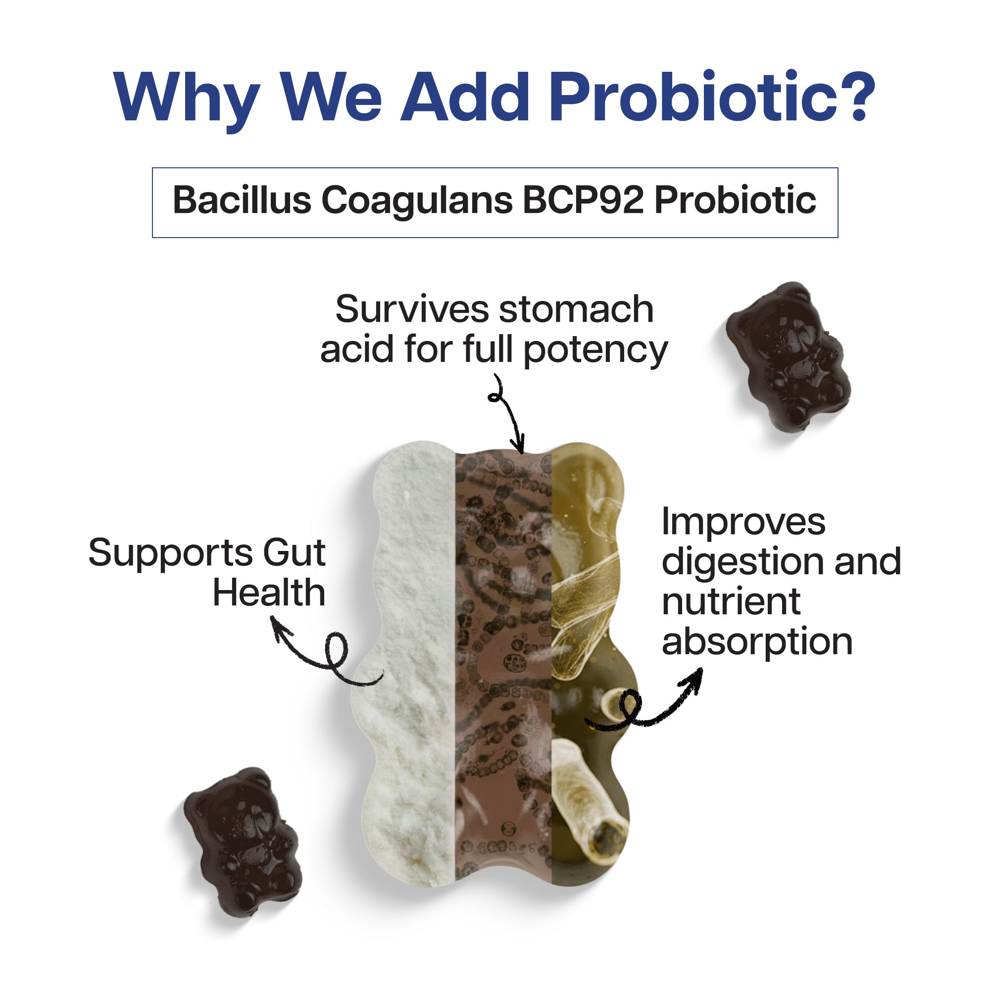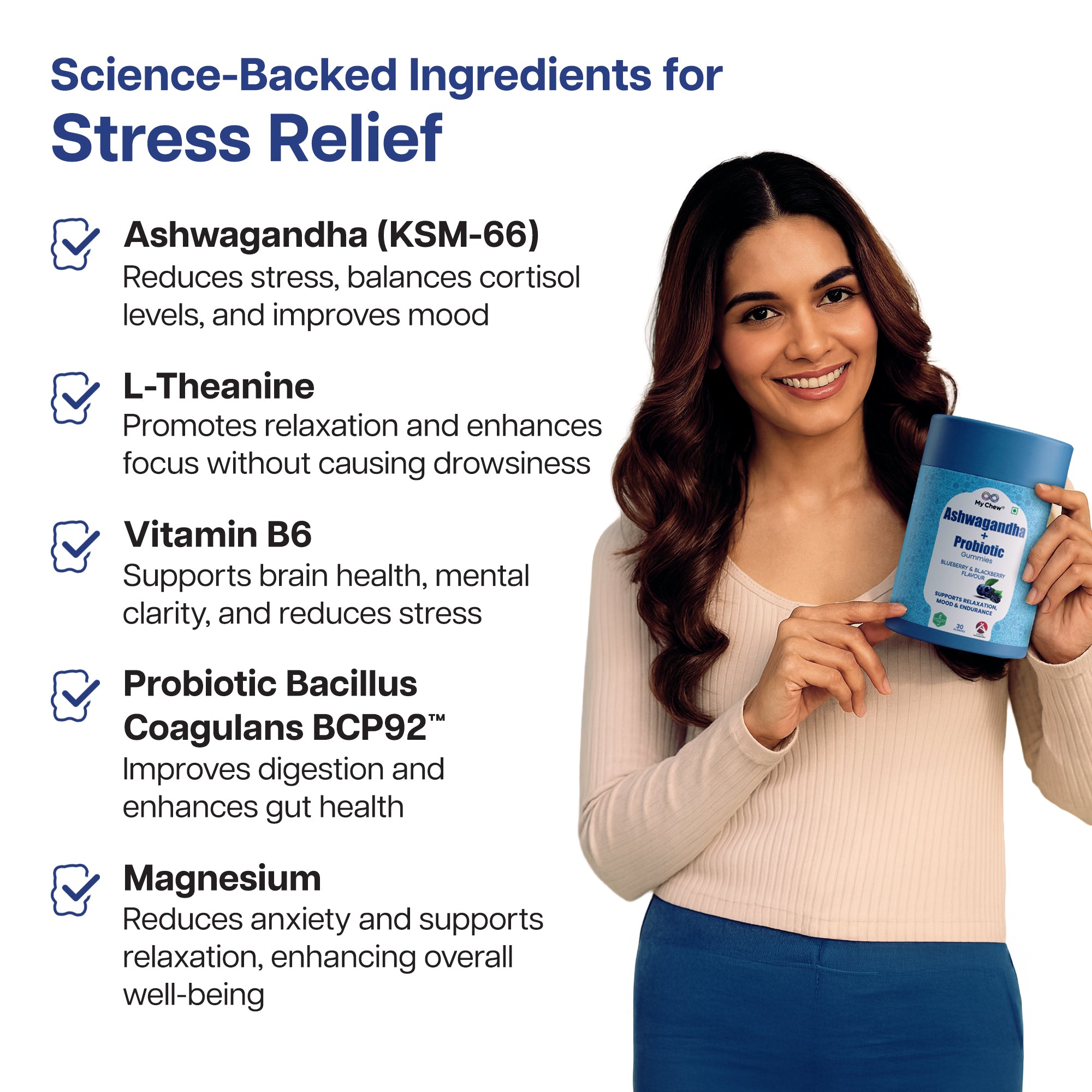Berry-flavored gummies combining Ashwagandha, Vitamin D3, and BCP92™ probiotics to promote calm, cognitive clarity, and immune support.