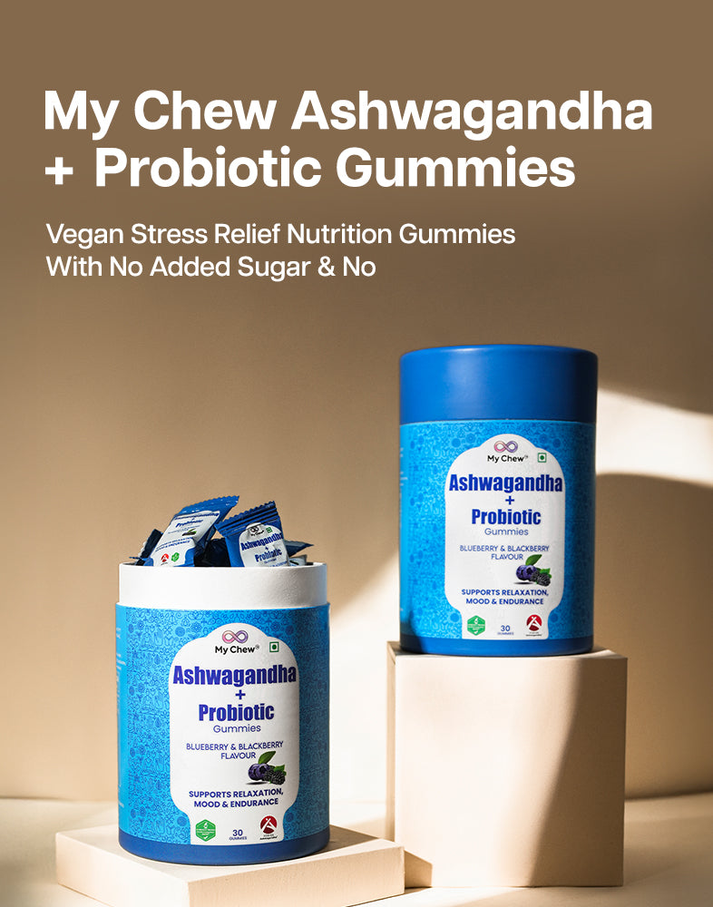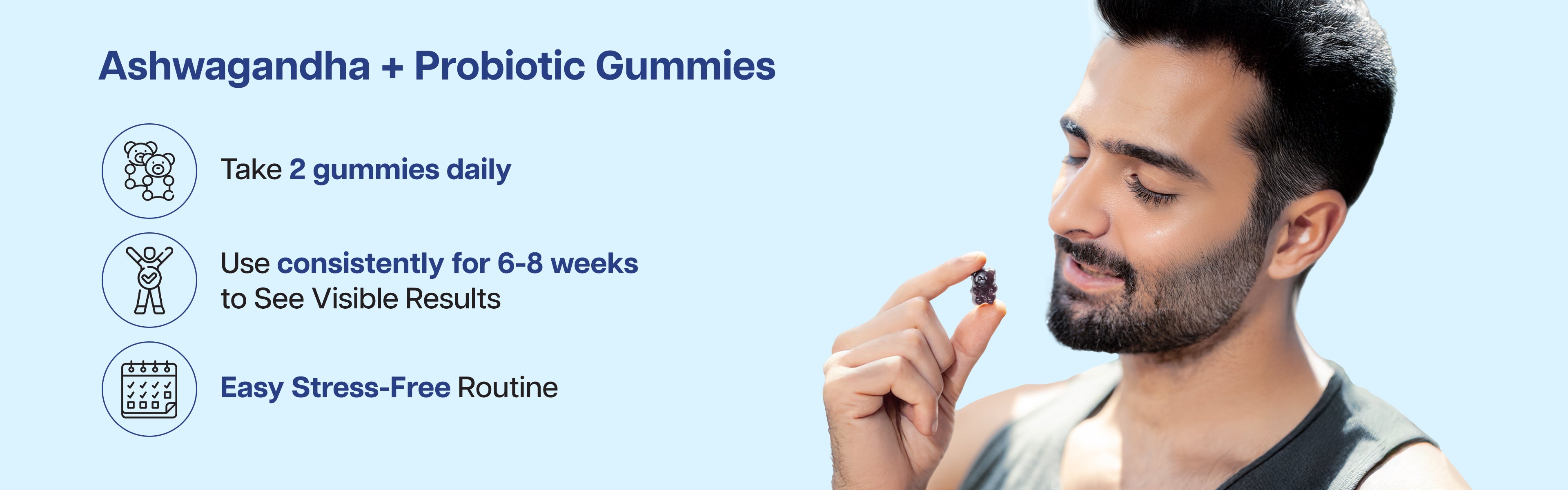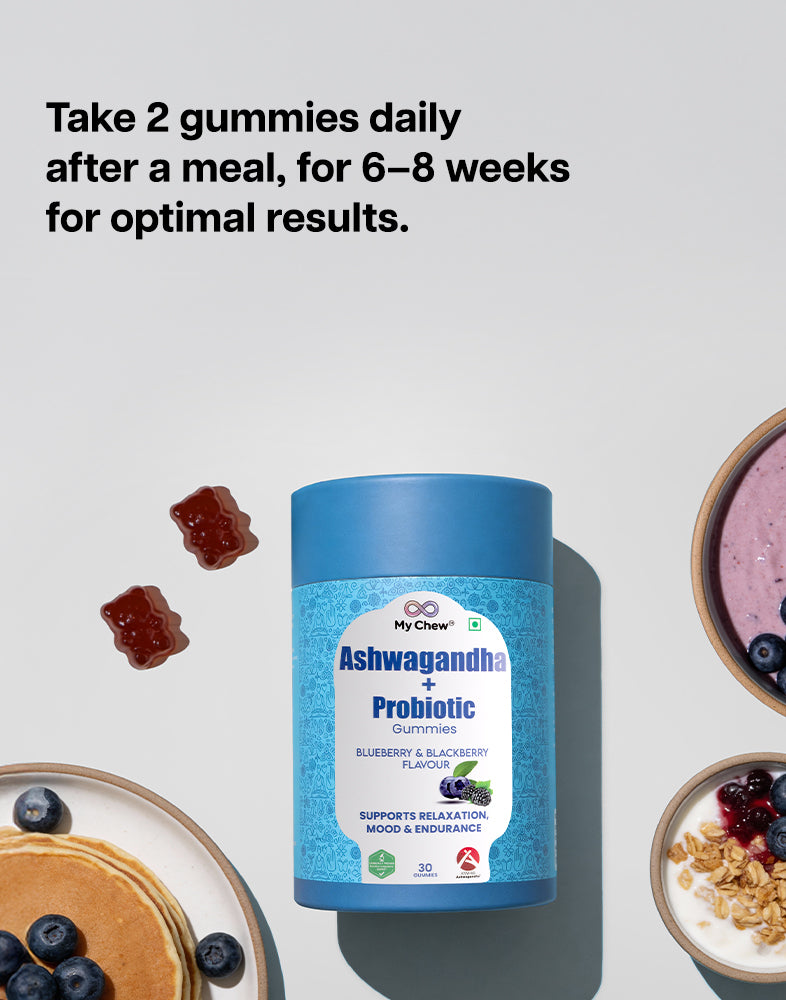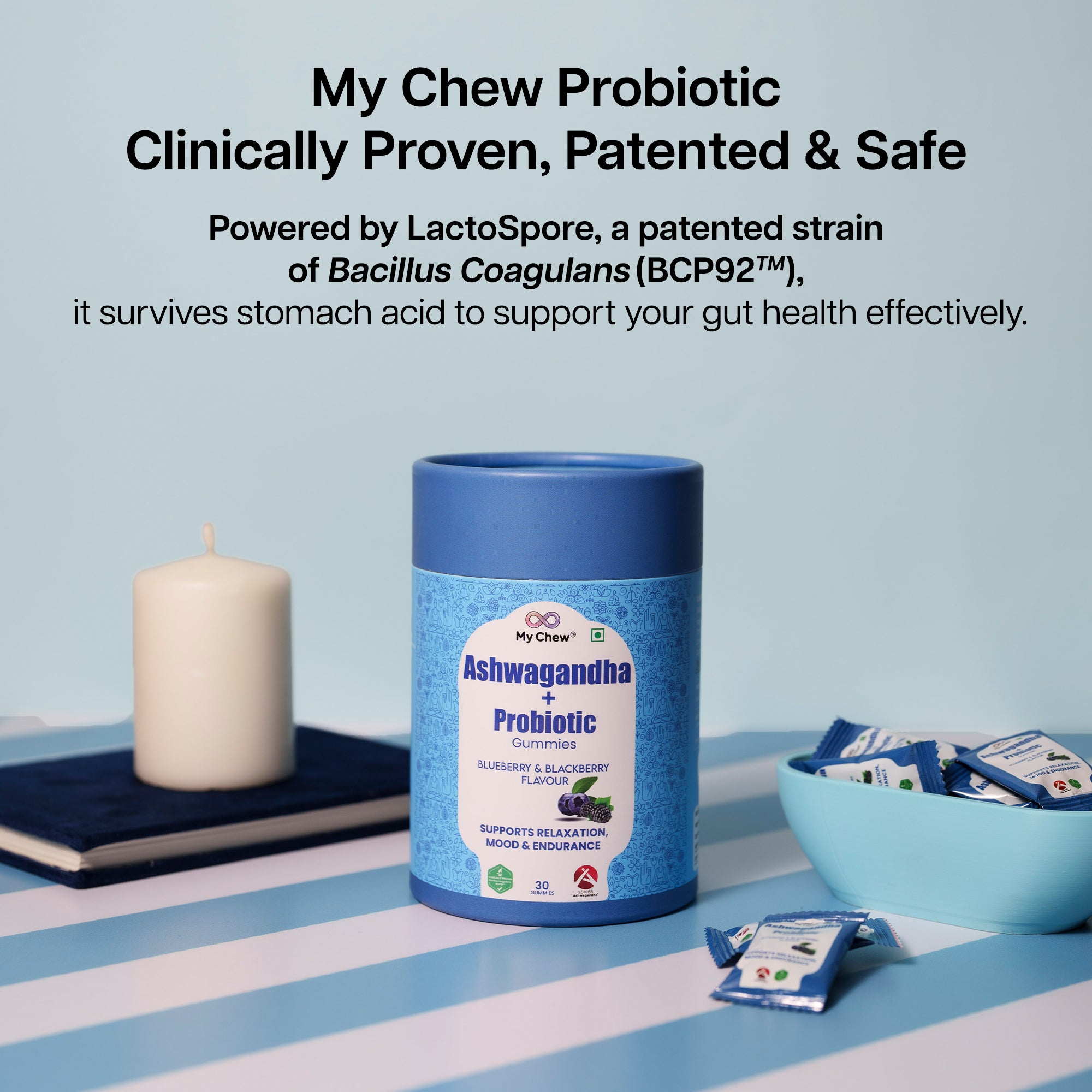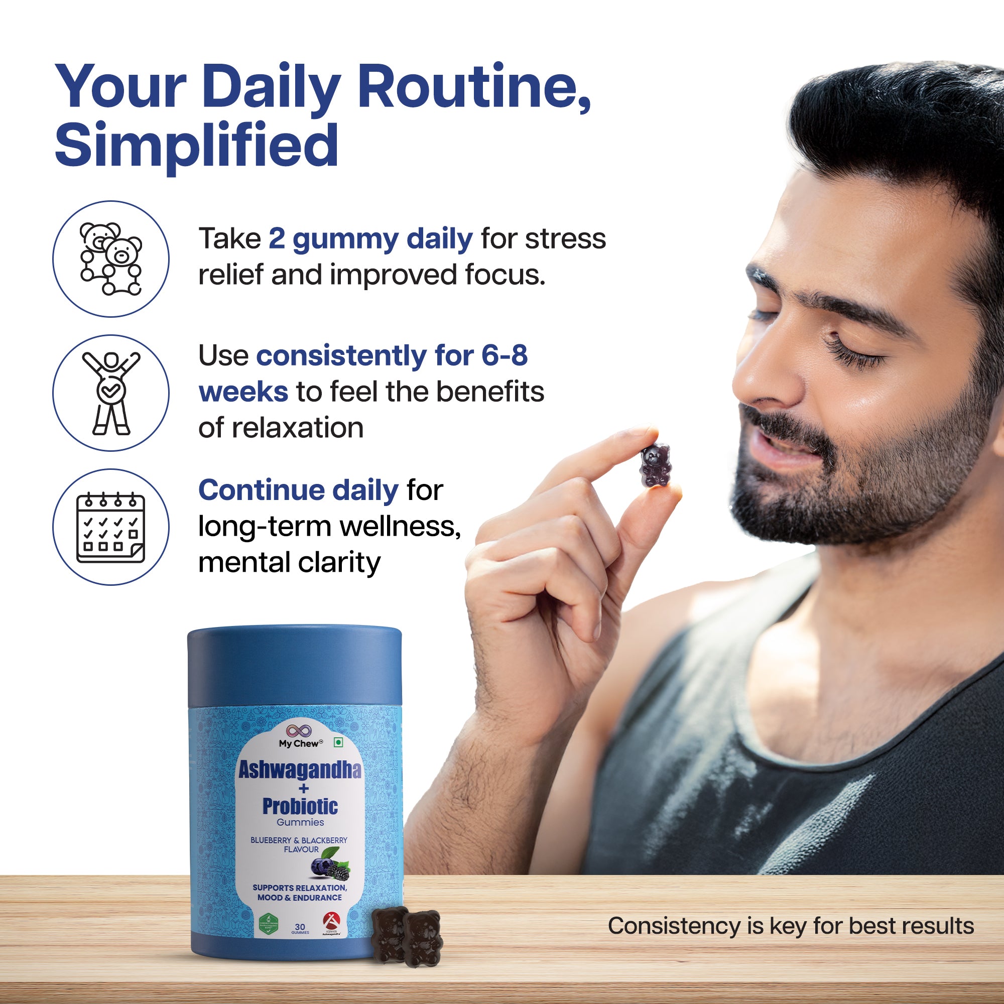 Berry-flavored gummies combining Ashwagandha, Vitamin D3, and BCP92™ probiotics to promote calm, cognitive clarity, and immune support.