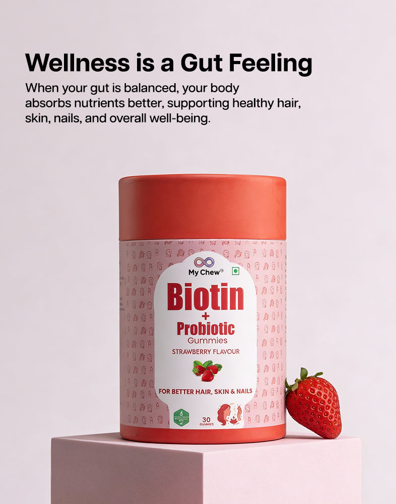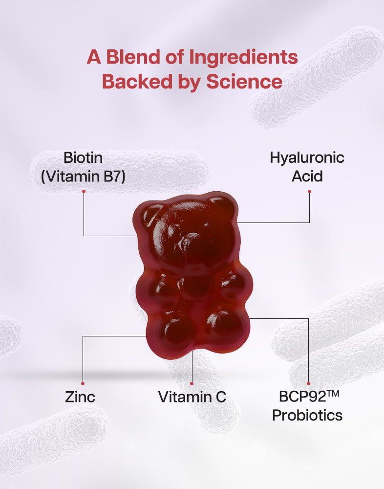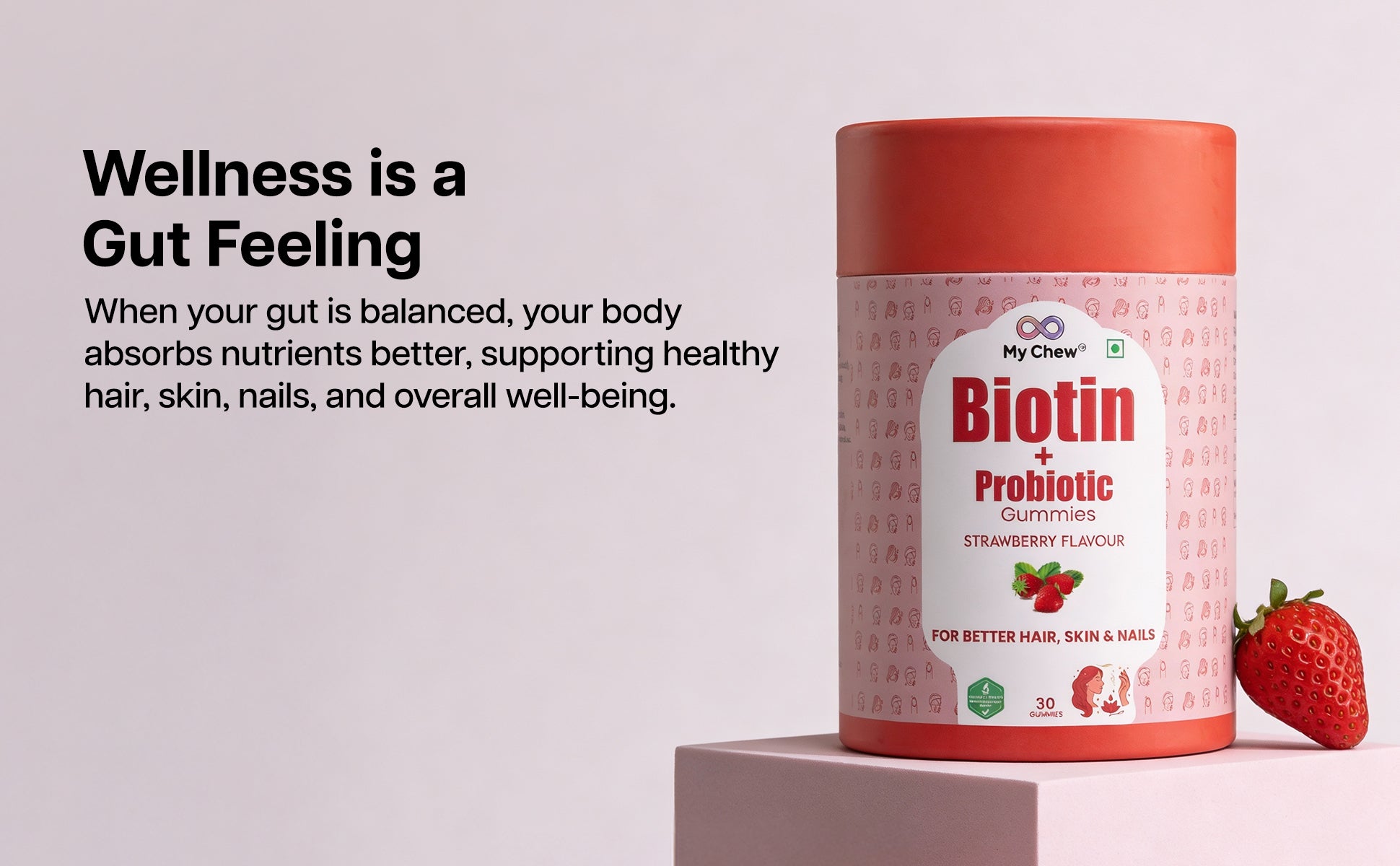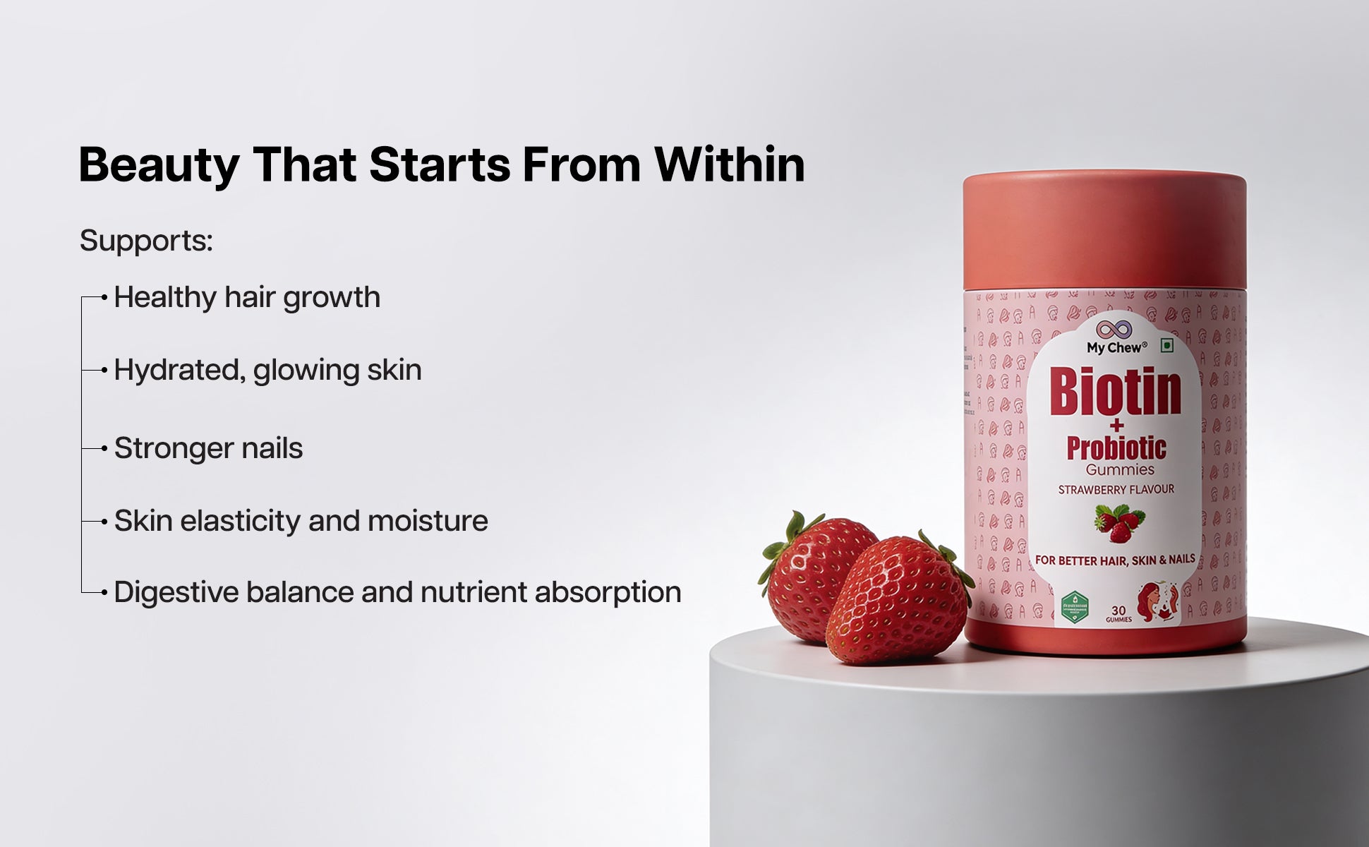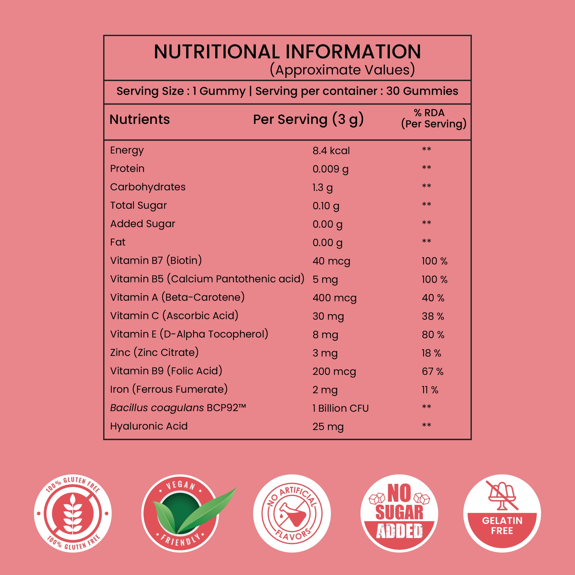 Delicious gummies enriched with Biotin, Hyaluronic Acid, essential vitamins, and probiotics to support natural beauty, gut health, and overall wellness.
