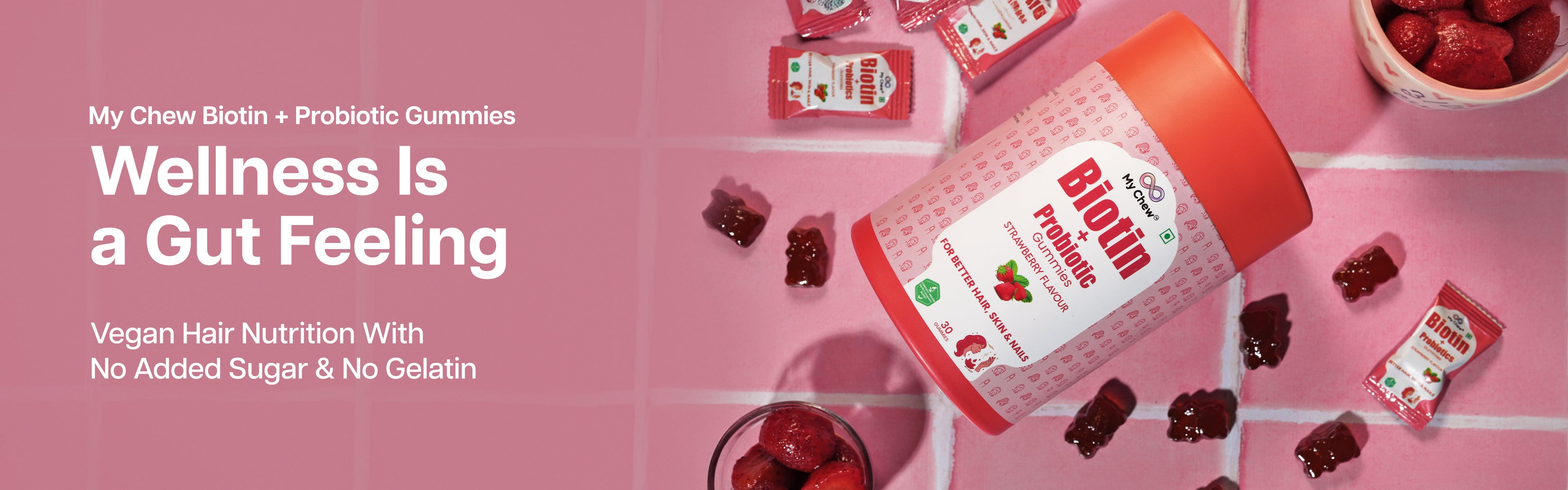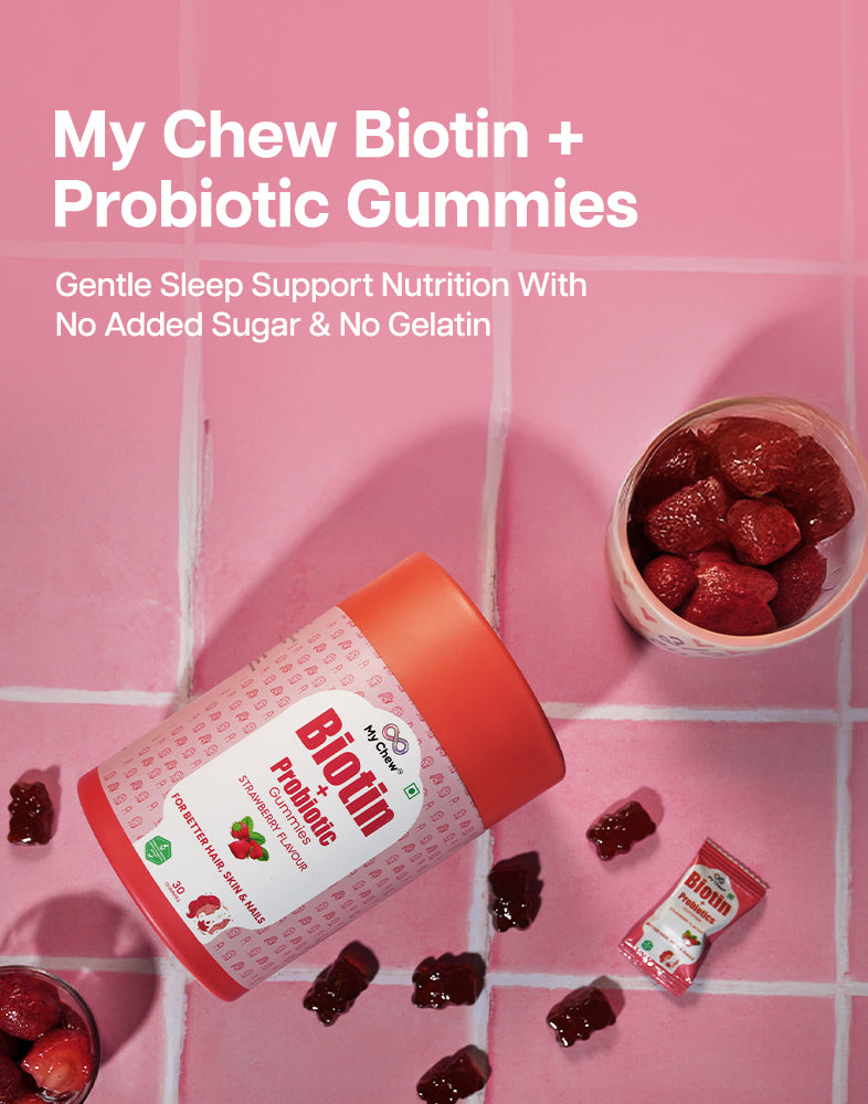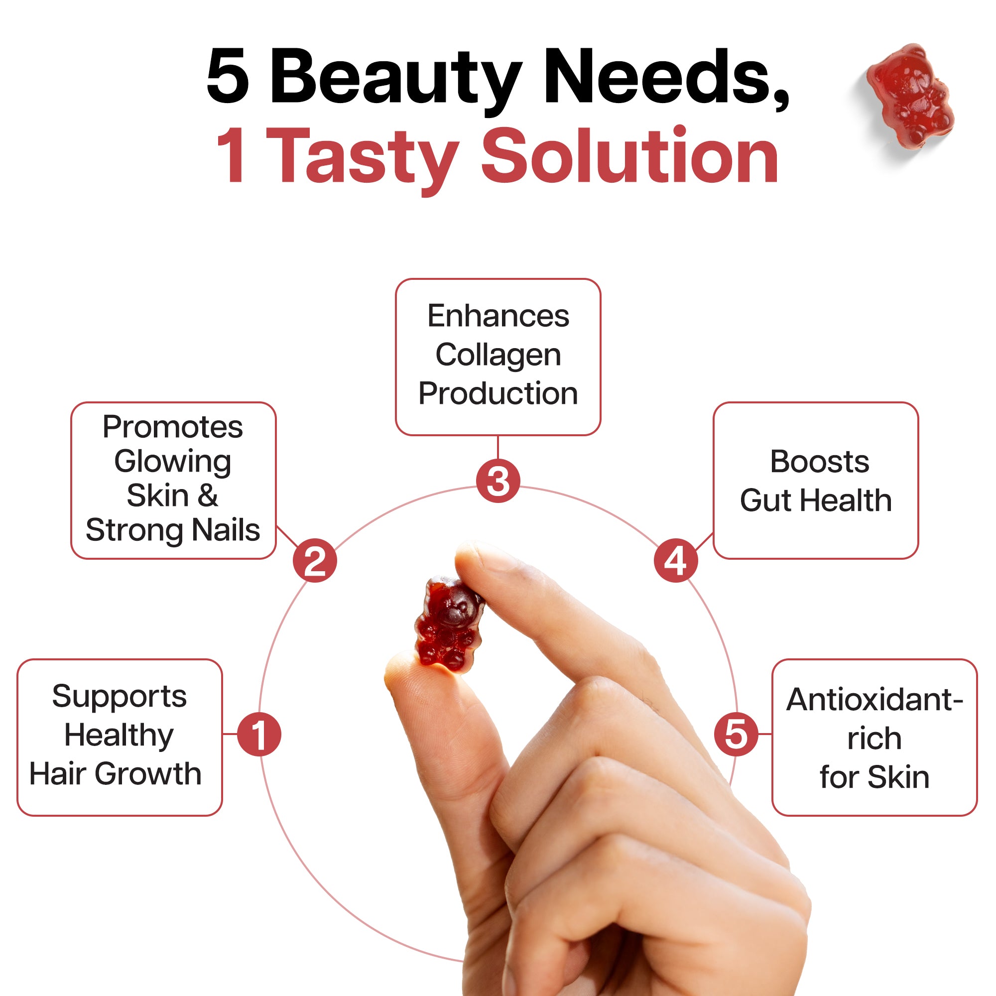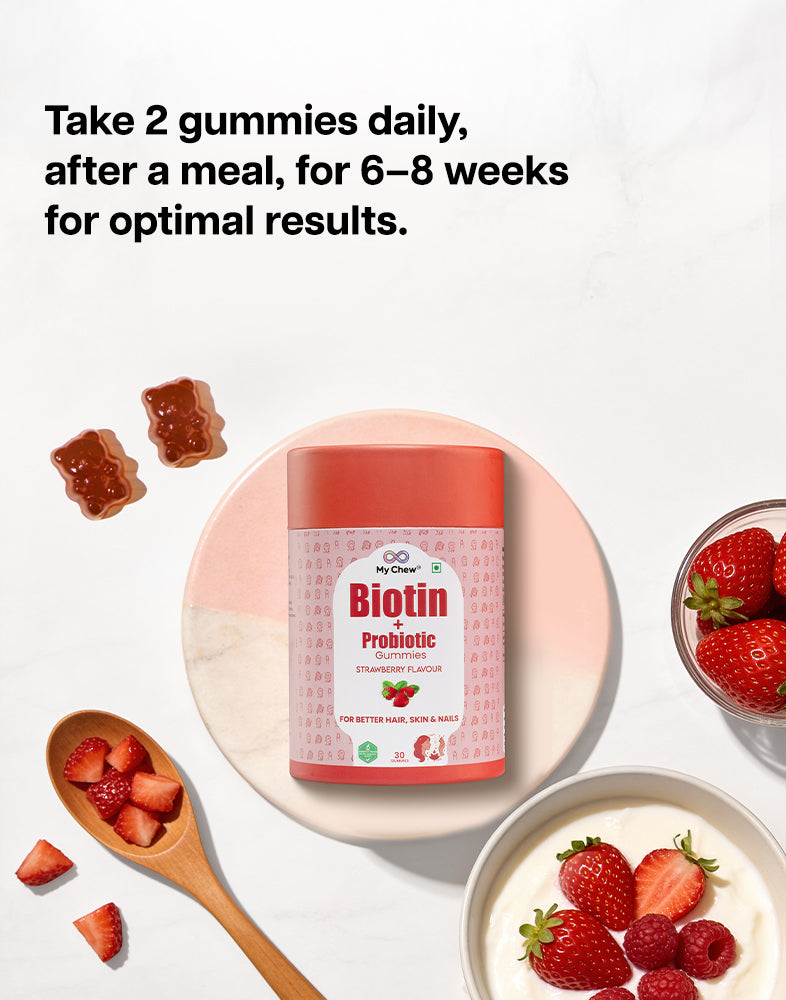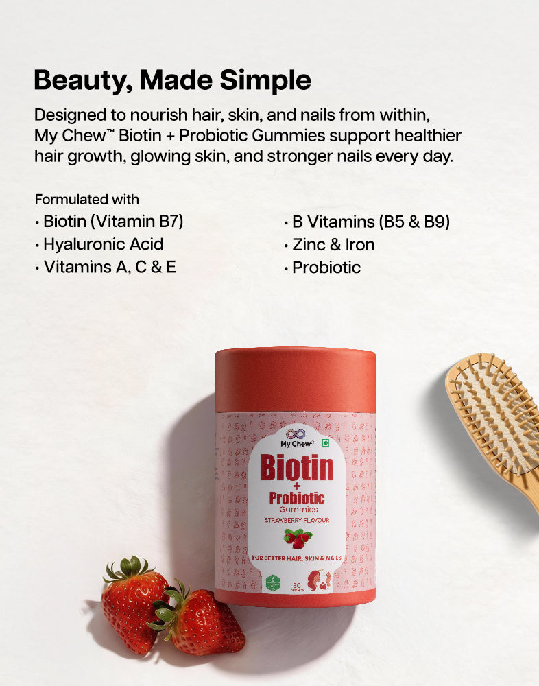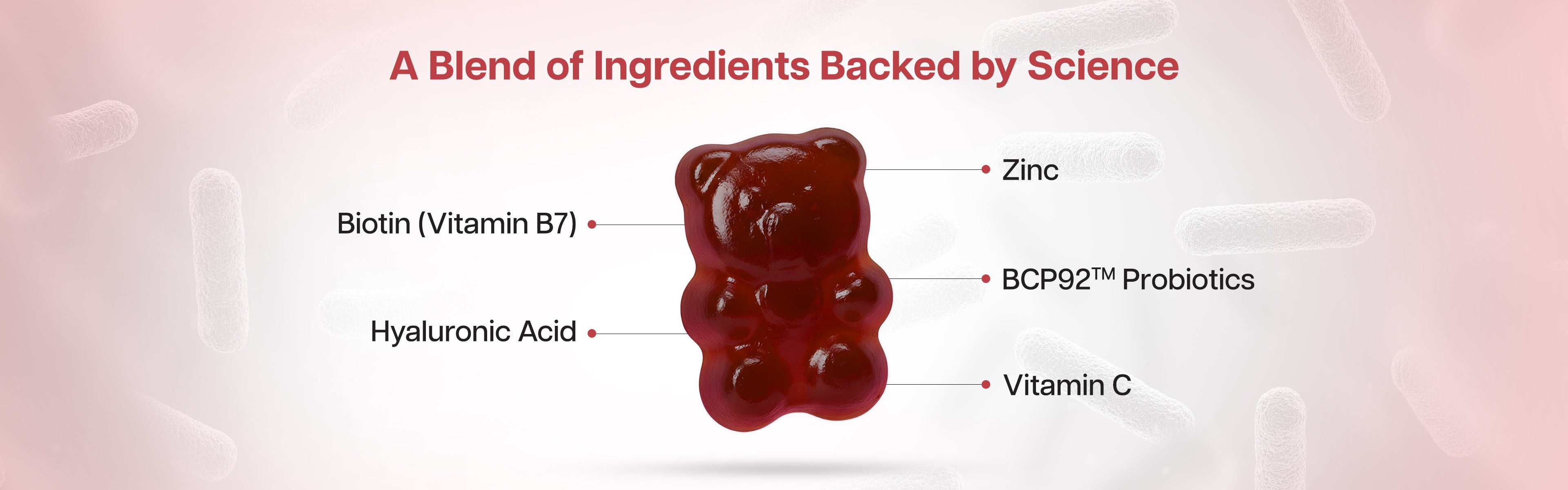 Delicious gummies enriched with Biotin, Hyaluronic Acid, essential vitamins, and probiotics to support natural beauty, gut health, and overall wellness.