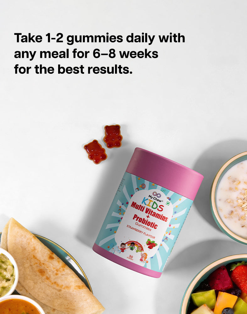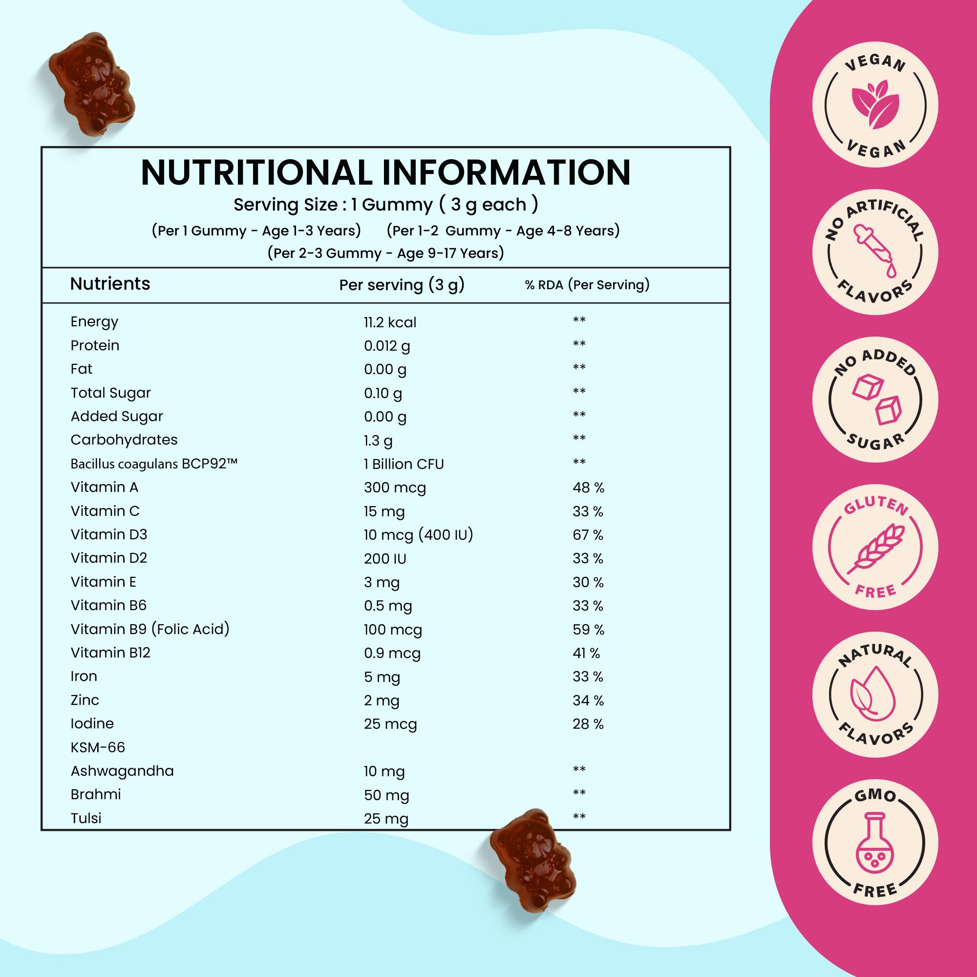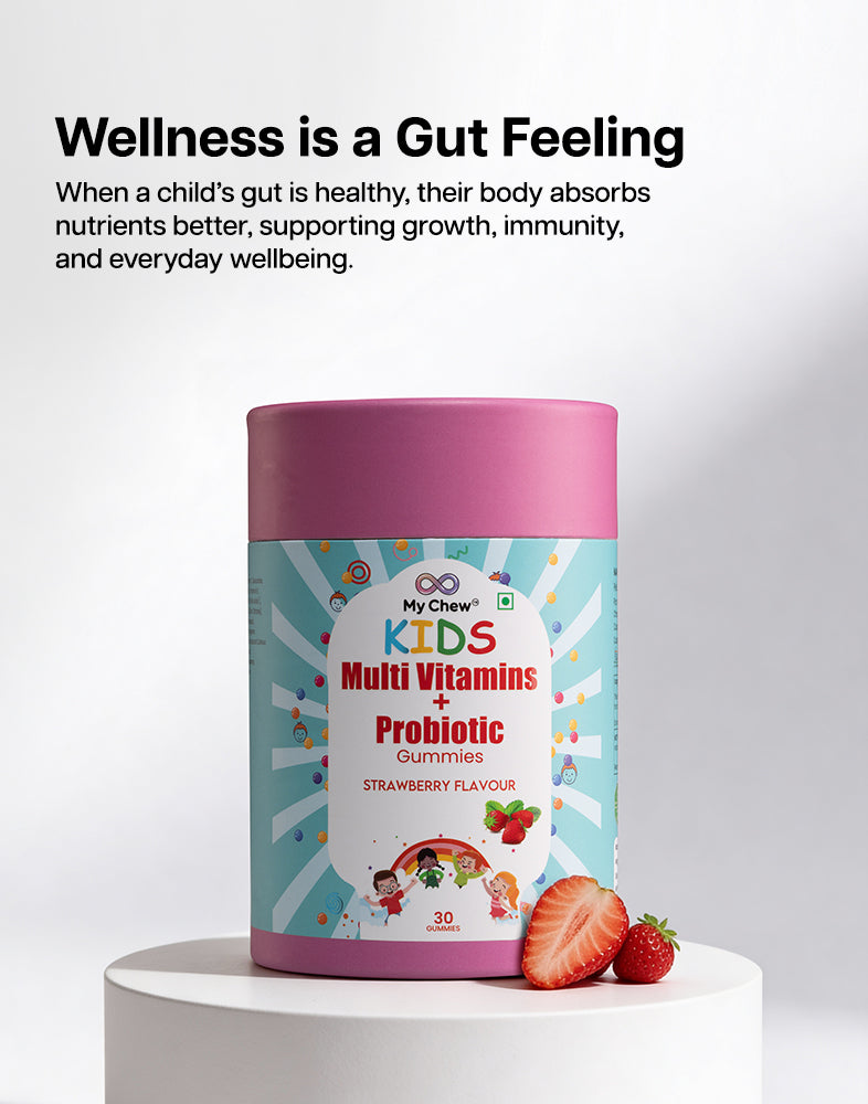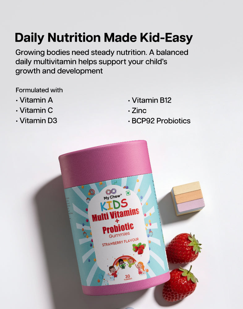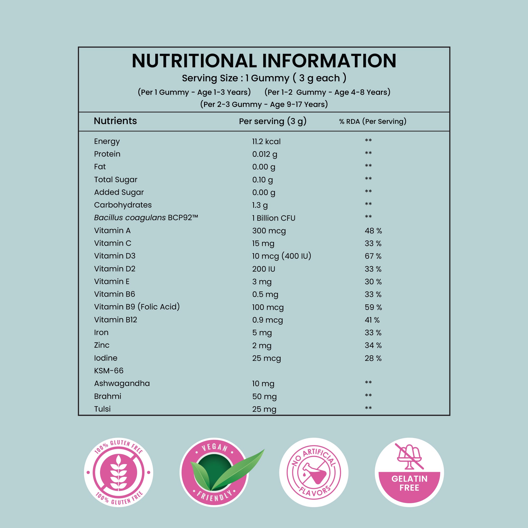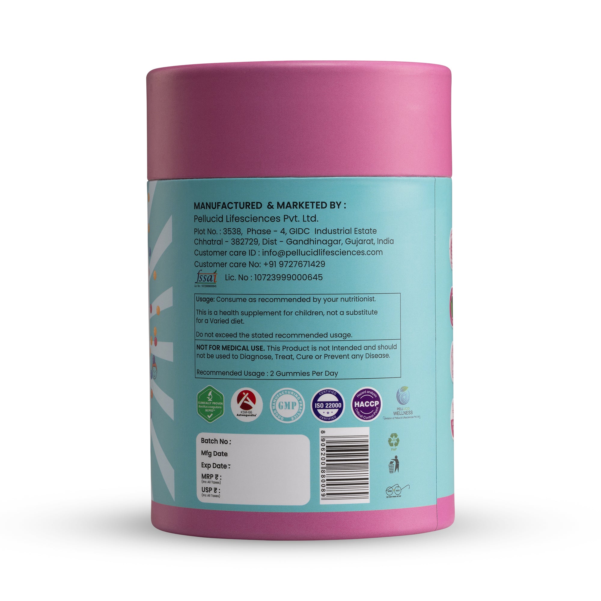 A delicious, fruit-flavored multivitamin gummy for kids, packed with essential vitamins, minerals, probiotics, and herbs to support healthy growth, immunity, and cognitive development.