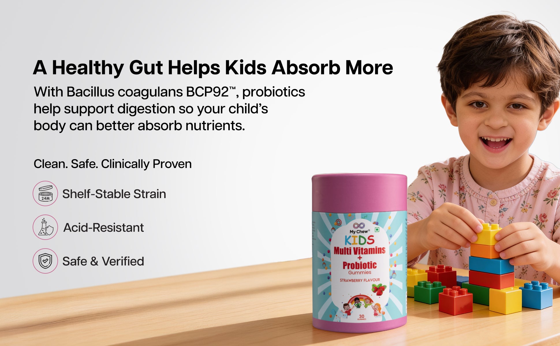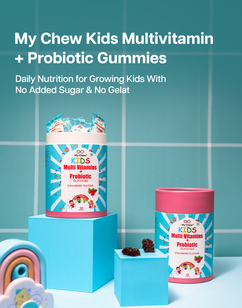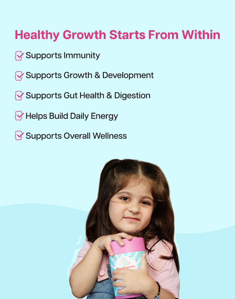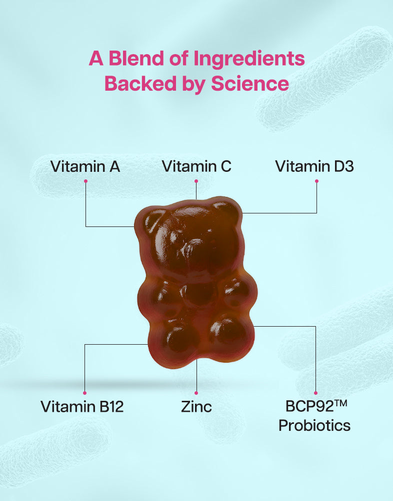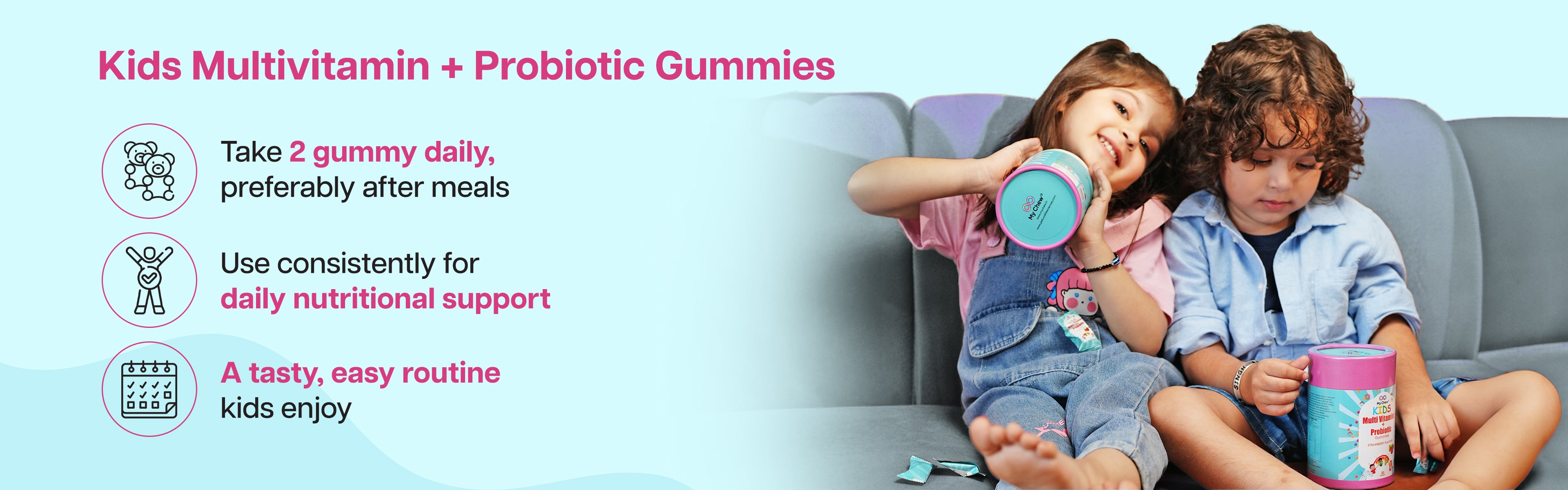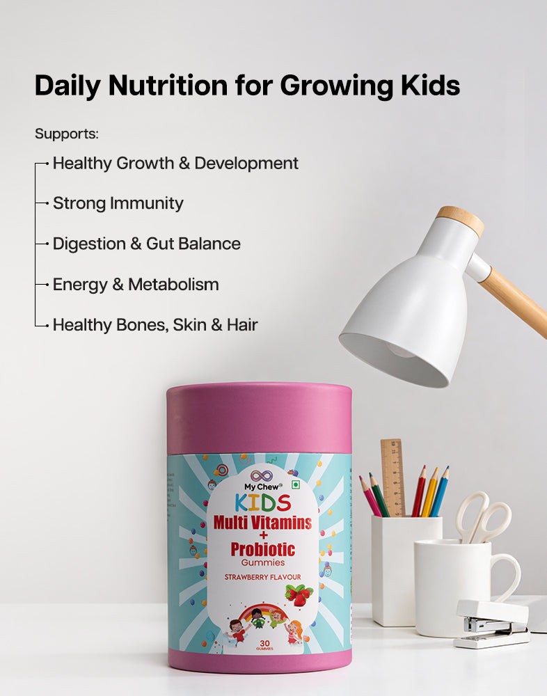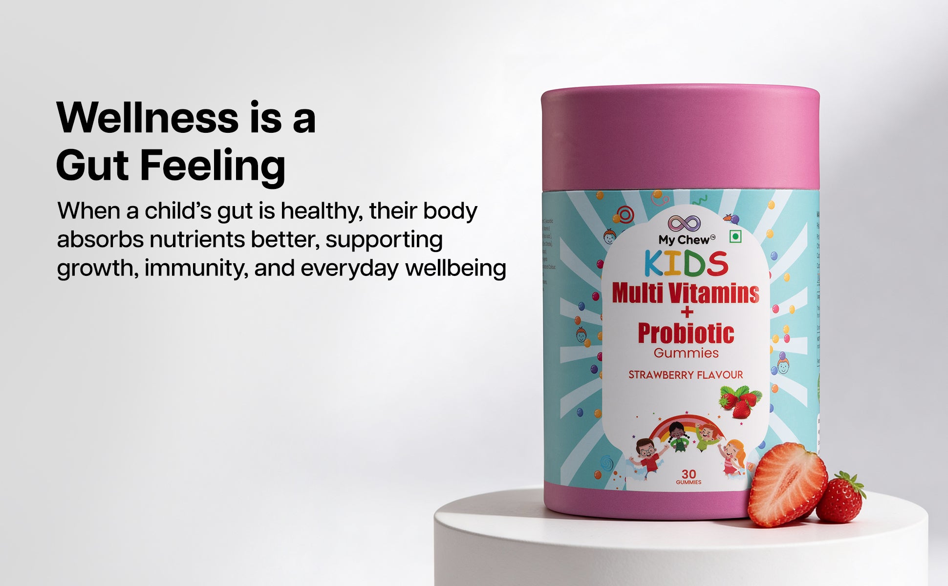A delicious, fruit-flavored multivitamin gummy for kids, packed with essential vitamins, minerals, probiotics, and herbs to support healthy growth, immunity, and cognitive development.