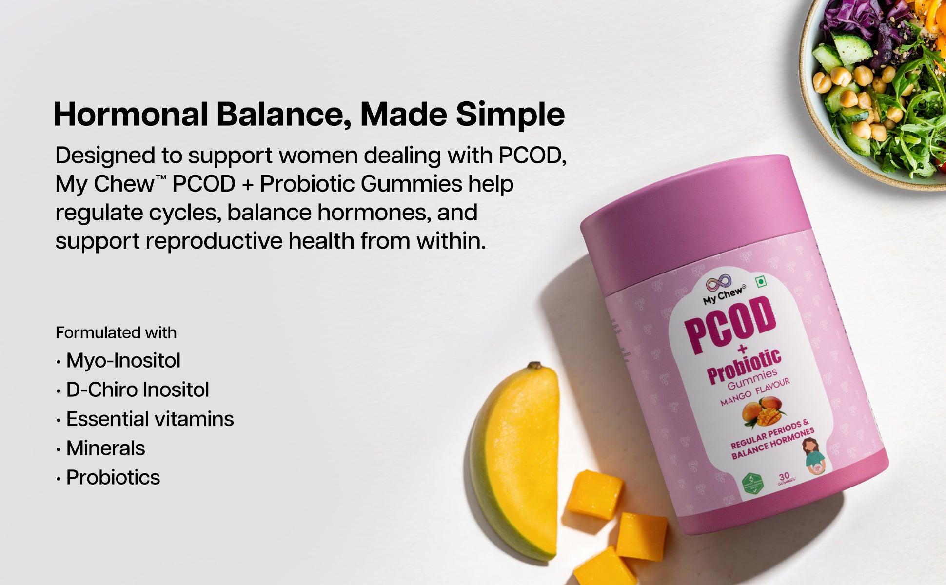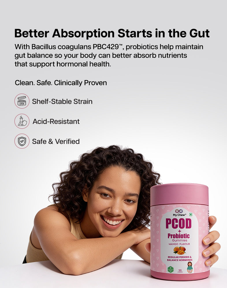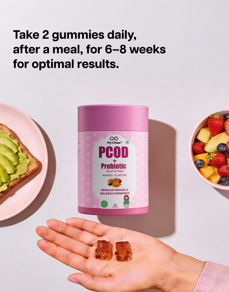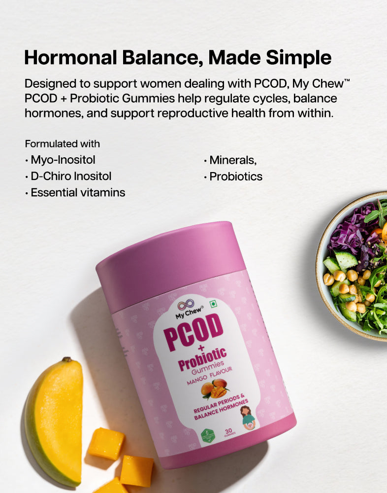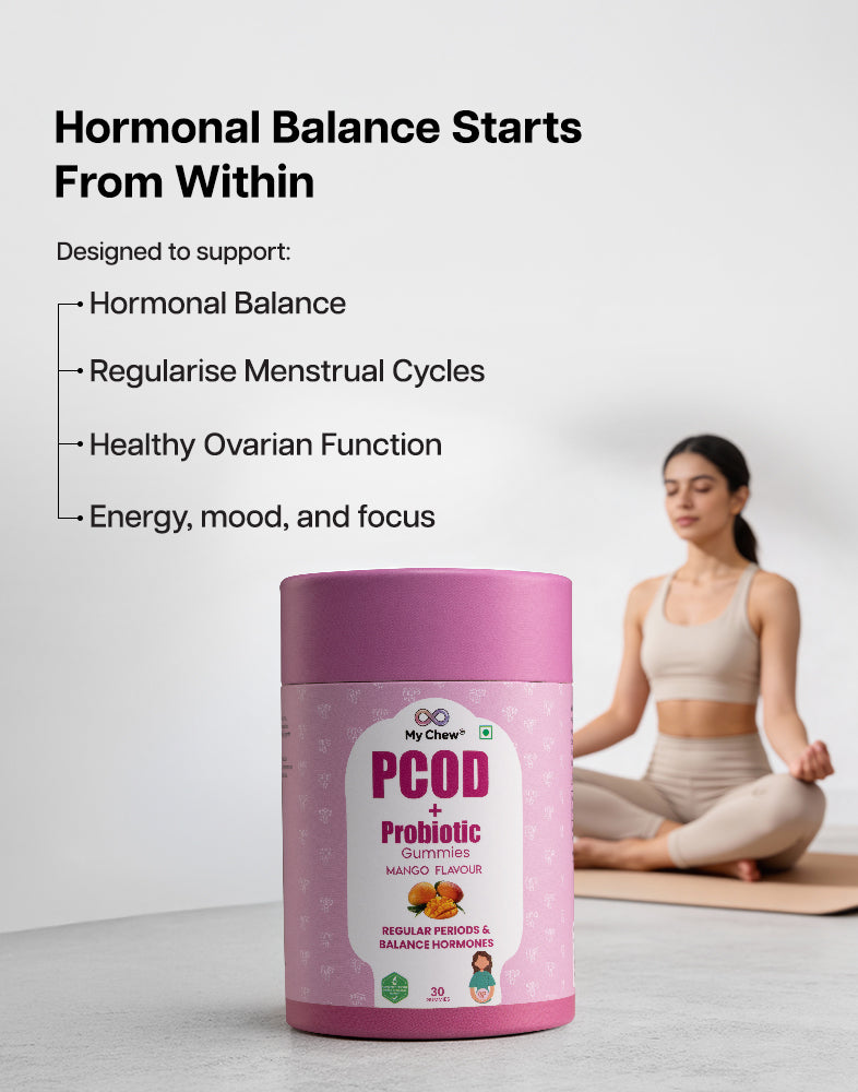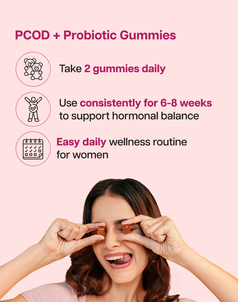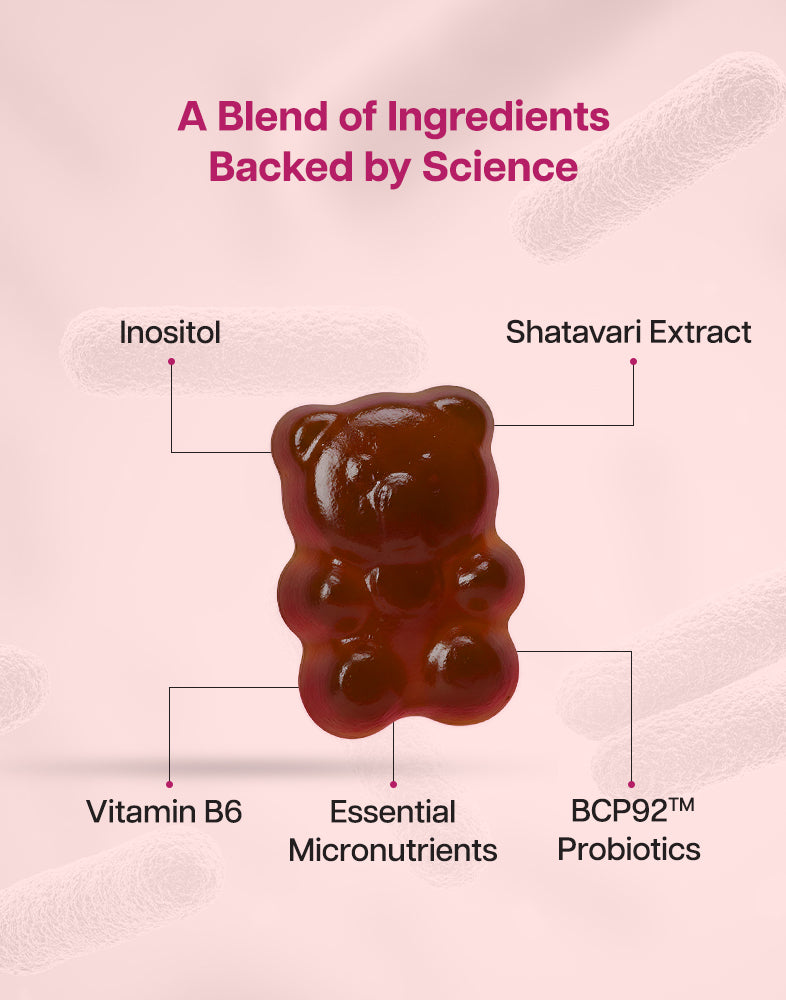A natural, delicious gummy designed to regulate menstrual cycles, support ovarian function, and promote overall wellness for women with PCOD.