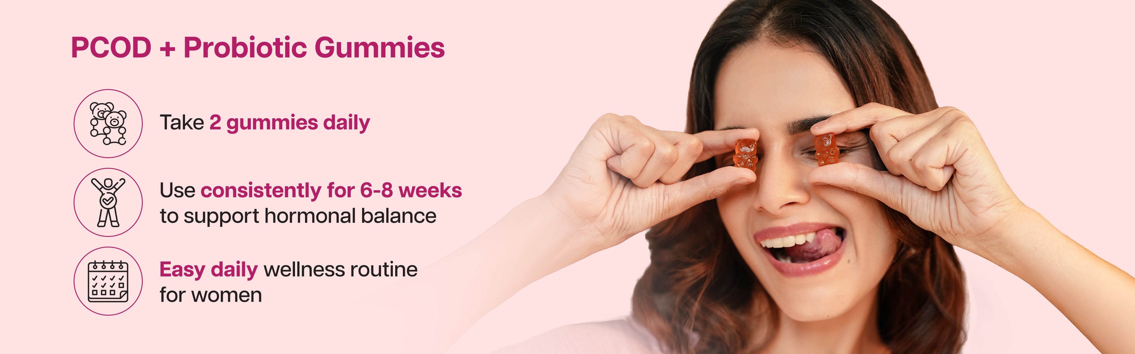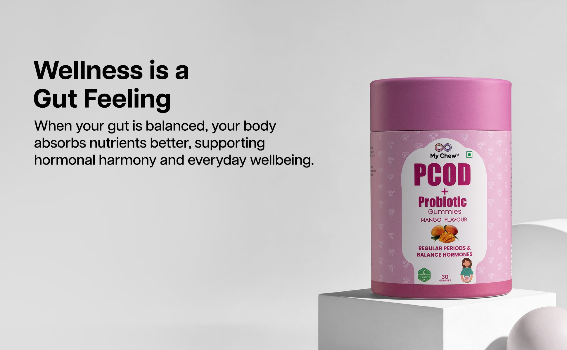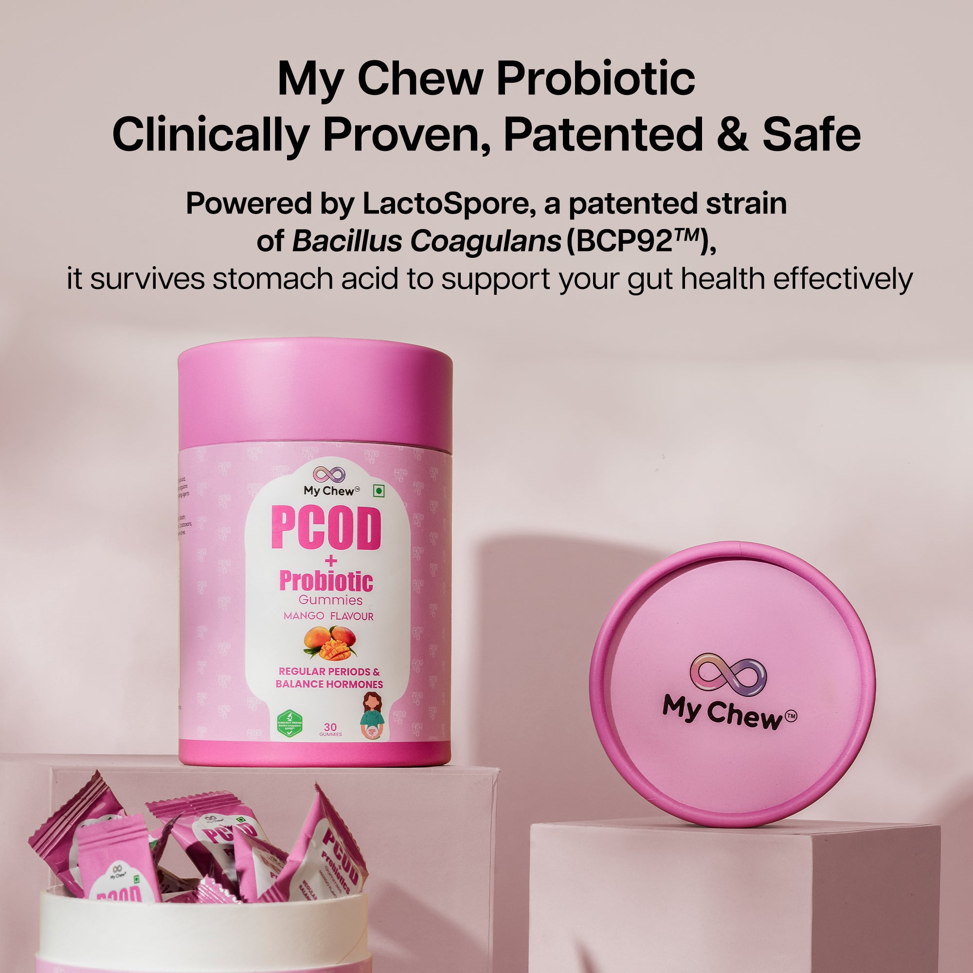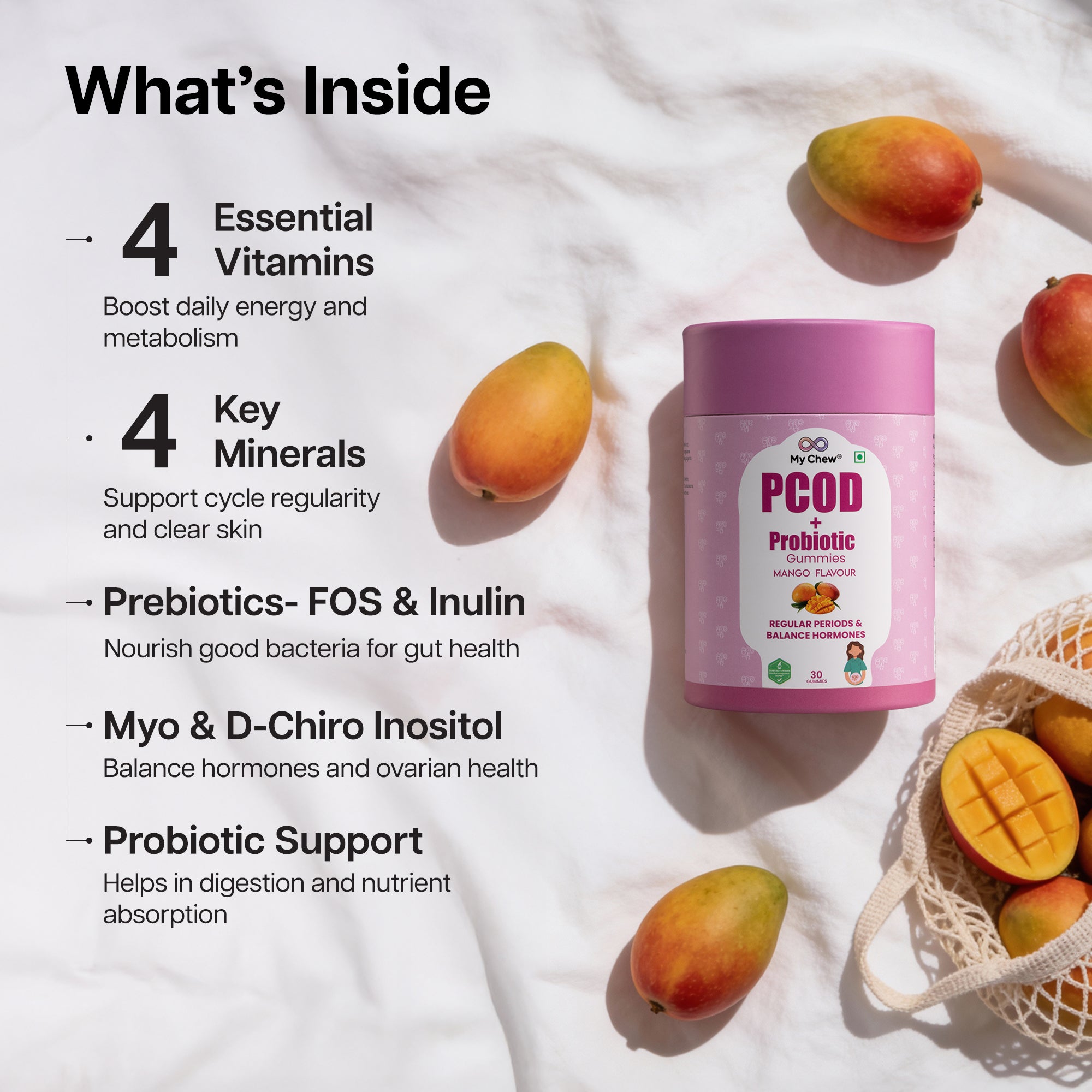 A natural, delicious gummy designed to regulate menstrual cycles, support ovarian function, and promote overall wellness for women with PCOD.